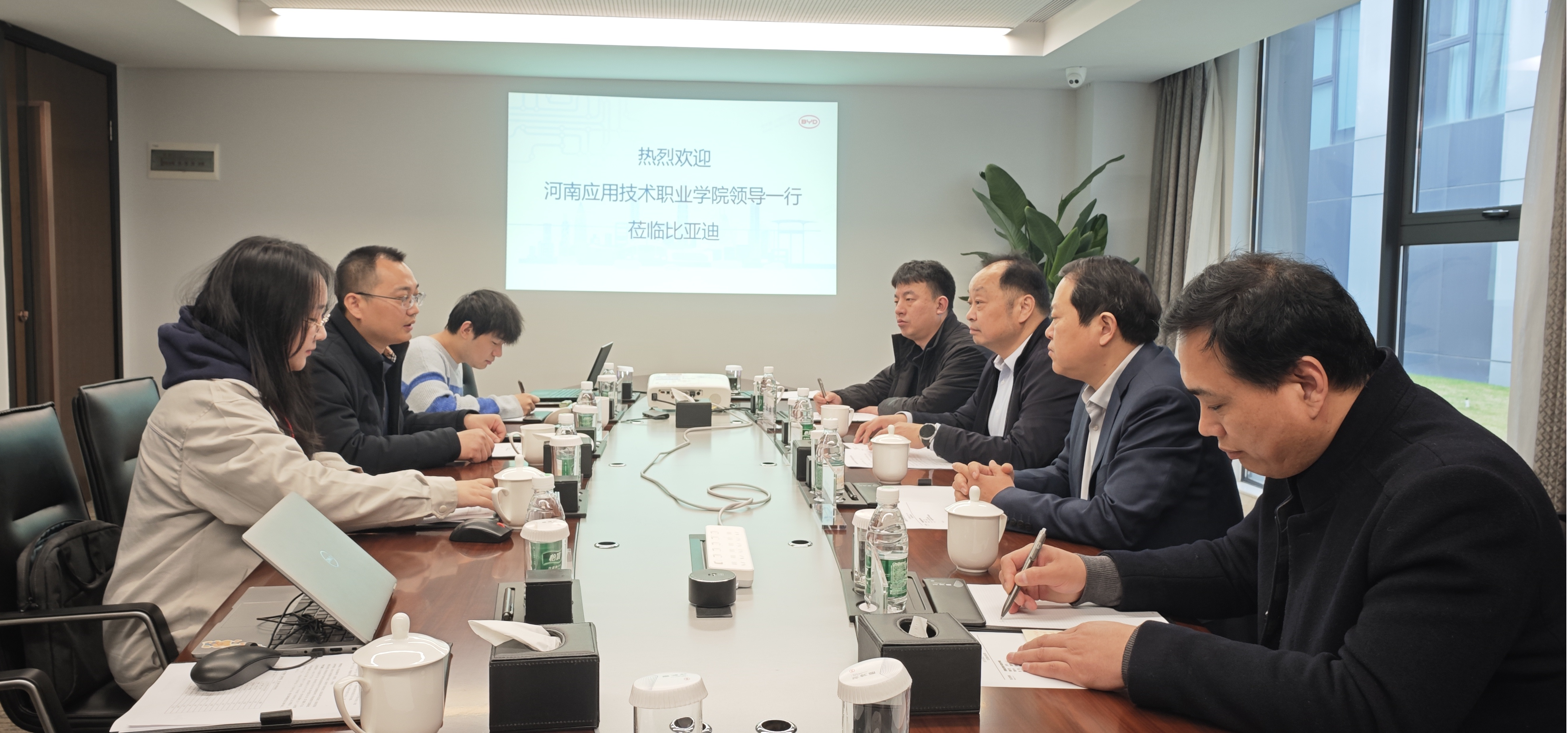 3月7日,校长薄新党,副校长常新中,院长办公室及304永利集团官网入口负责人一行4人赴深圳比亚迪股份有限公司调研交流。比亚迪股份有限公司人力资源处校企合作经理杨双喜及相关业务负责人热情接待并出席座谈会。