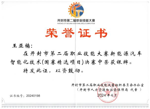 本次大赛由开封市人民政府主办,旨在全面检验和提升全市职业技能人才的专业素养和综合能力。在新能源汽车智能化技术项目的比赛中,我校参赛教师王亚楠、董芳甫展现出了高超的技能水平和出色的团队协作能力。他们凭借扎实的专业知识、精湛的操作技艺和冷静的应对能力,在比赛中脱颖而出,荣获银奖。这一成绩的取得,不仅是对我校参赛选手个人努力的肯定,更是对学校新能源汽车技术专业教育水平的认可。