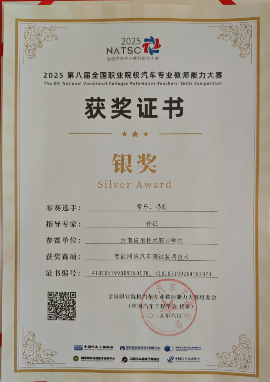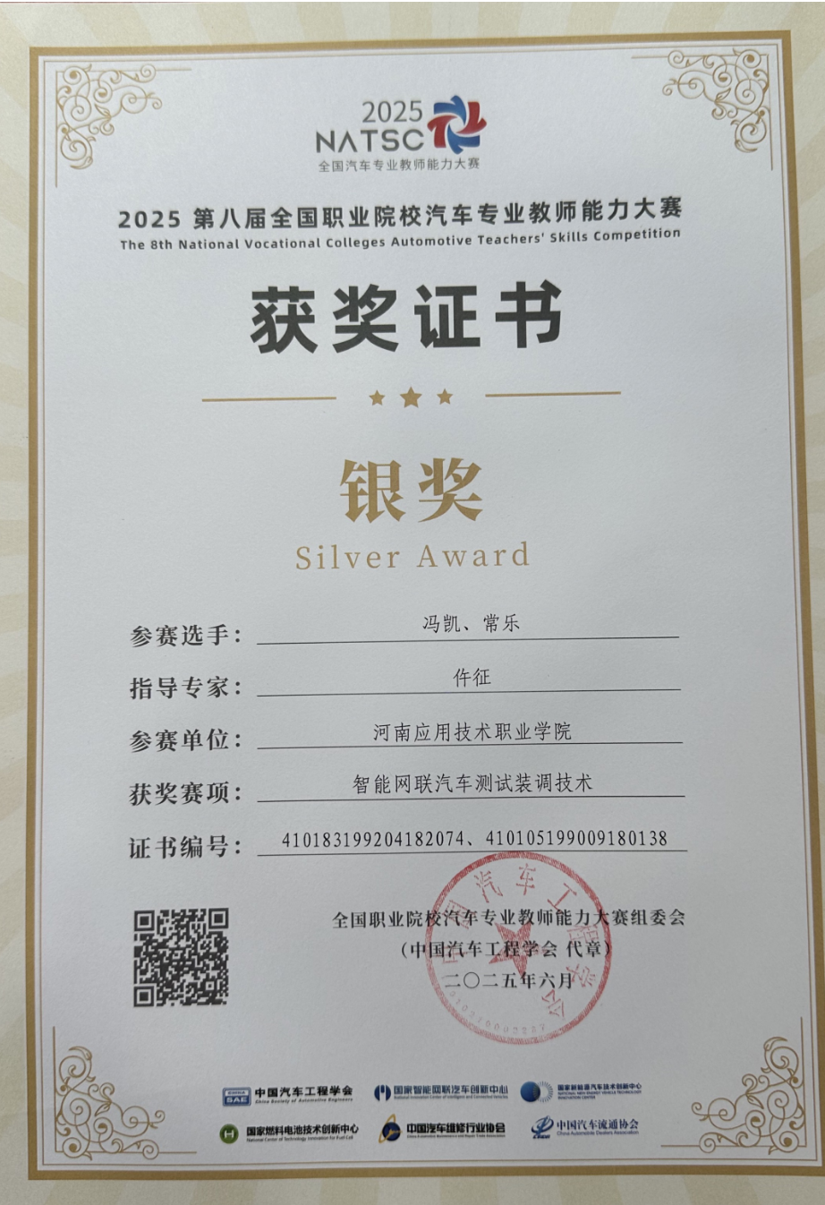 2025年6月22日,第八届全国职业院校汽车专业教师能力大赛“风向标杯”智能网联汽车测试装调技术赛项正式拉开帷幕,经过两天的激烈角逐,永利官网教师冯凯、常乐老师在副院长仵征带队下获得高职组银奖。